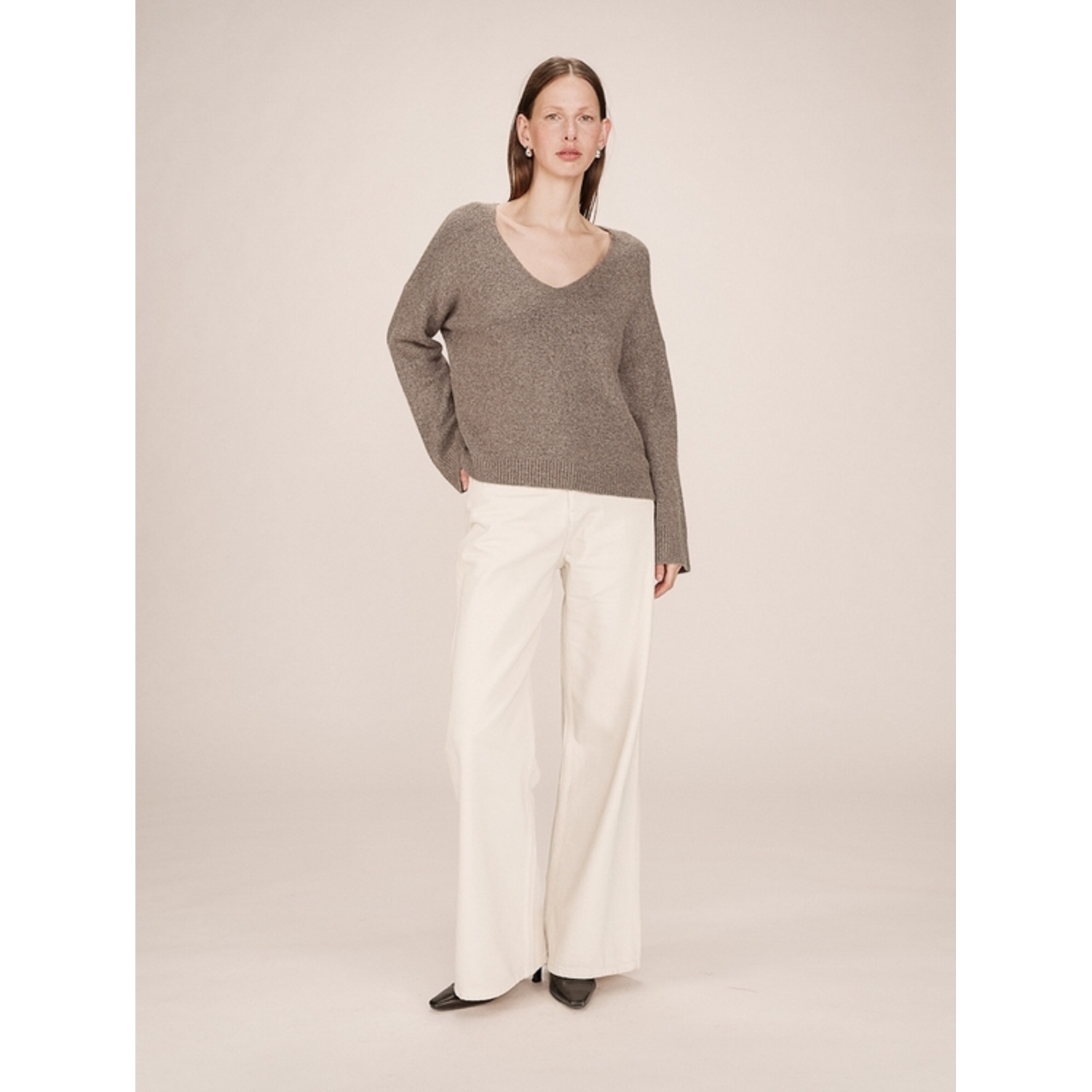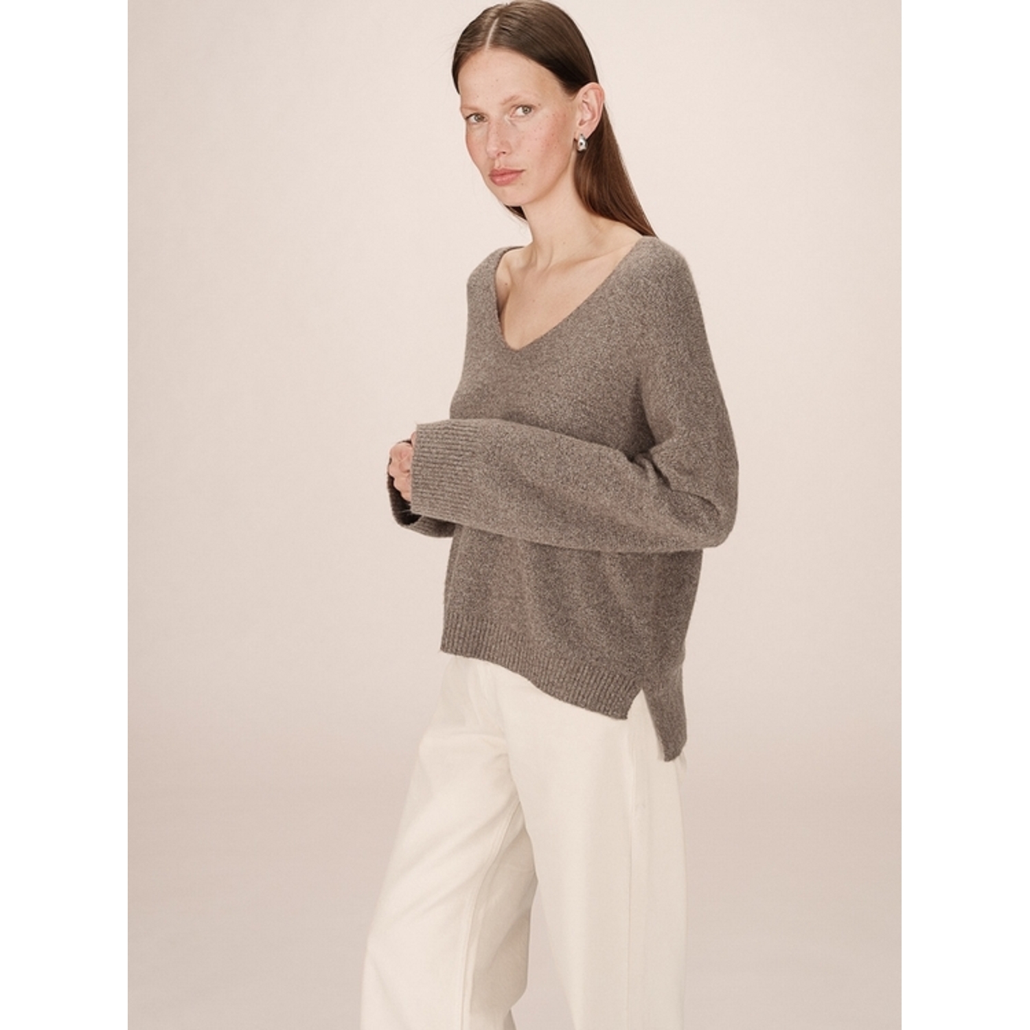 Pull intemporel de la maison. Manches longues, coupe large, et décolleté en V, avec un détail de fentes sur les cotés pour femme de la marque Grace & Mila.