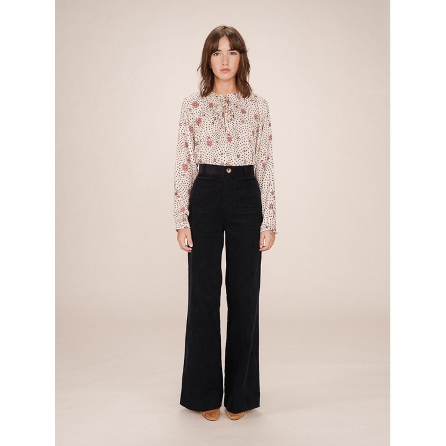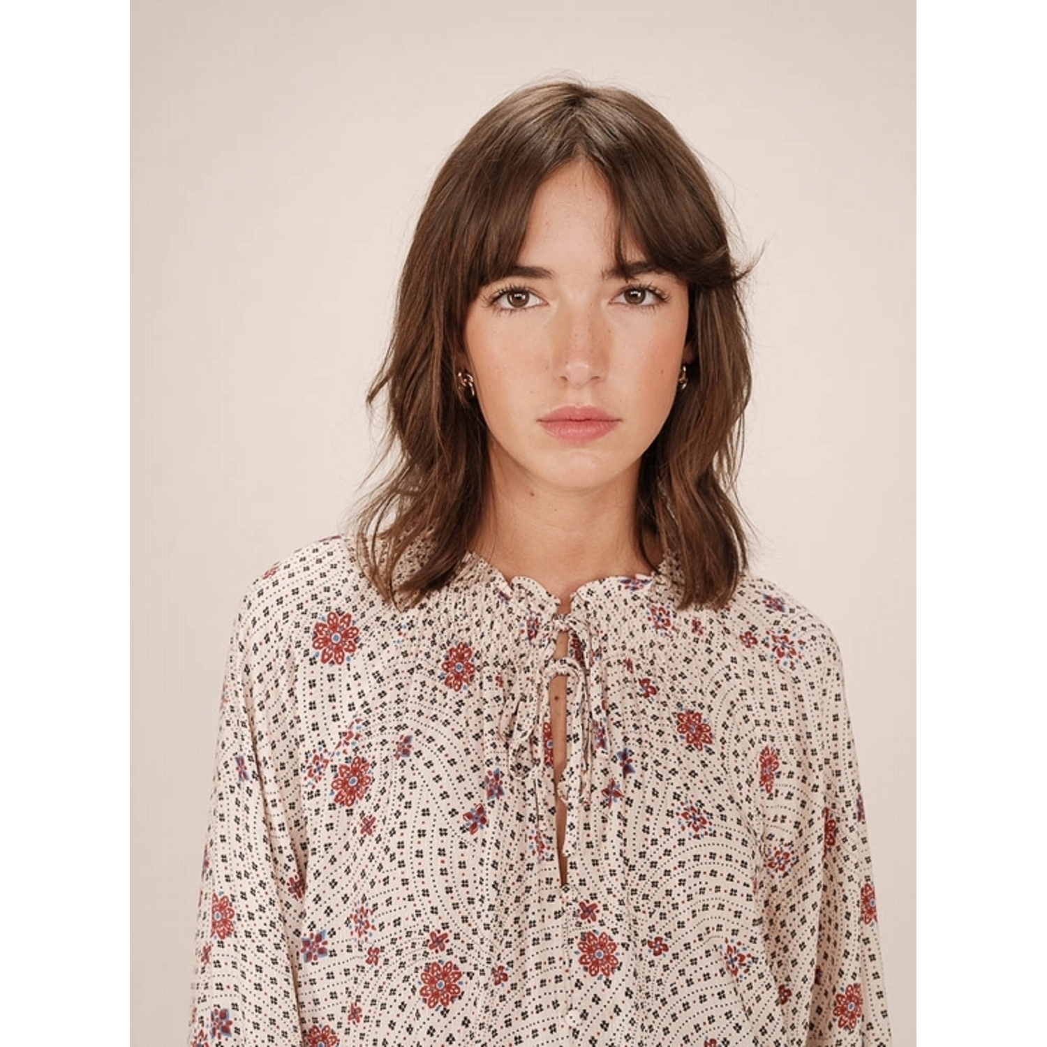 Blouse à manches longues, imprimée dans un motif floral seventies, avec un col smocké à volants et deux liens à nouer sur le devant pour femme de la marque Grace & Mila.