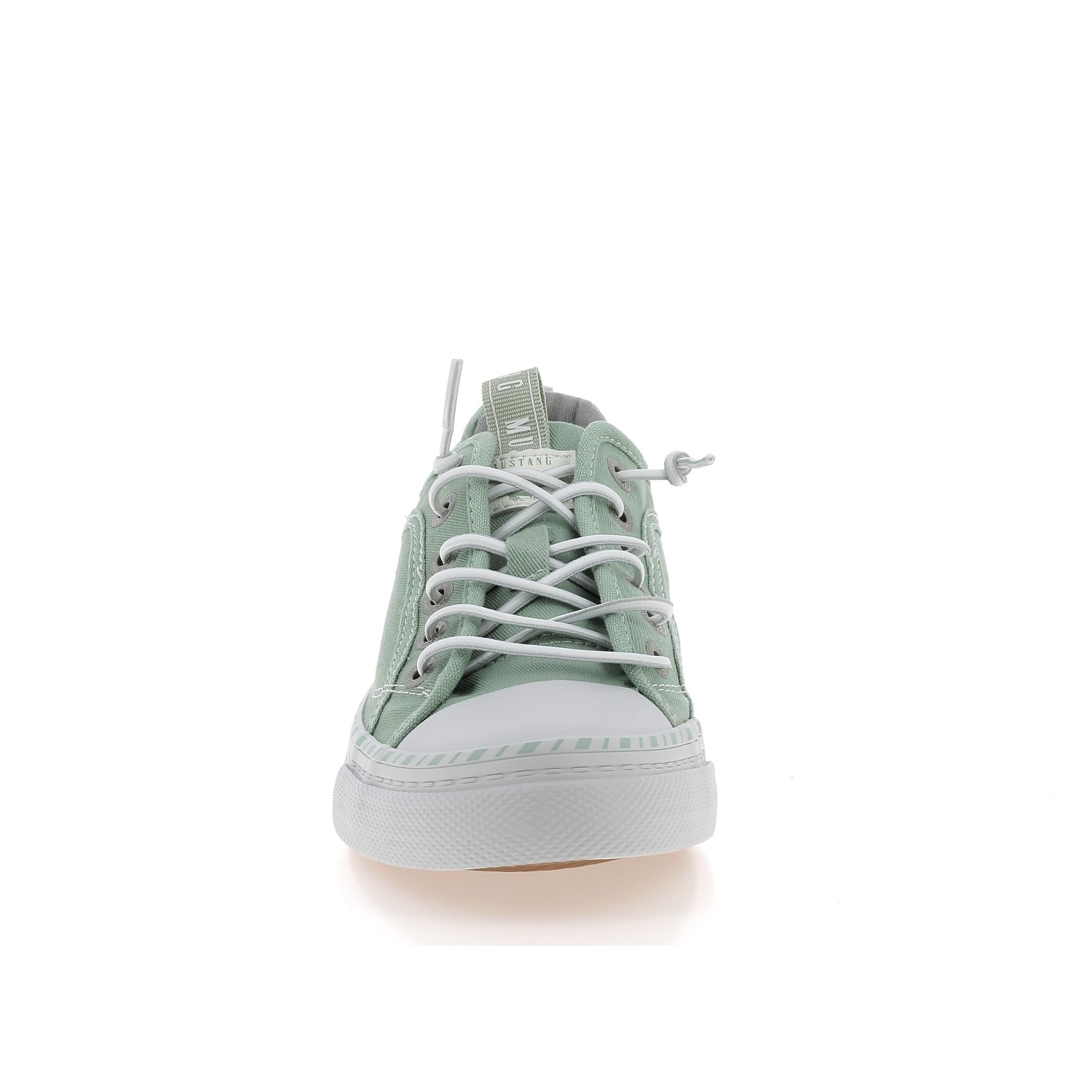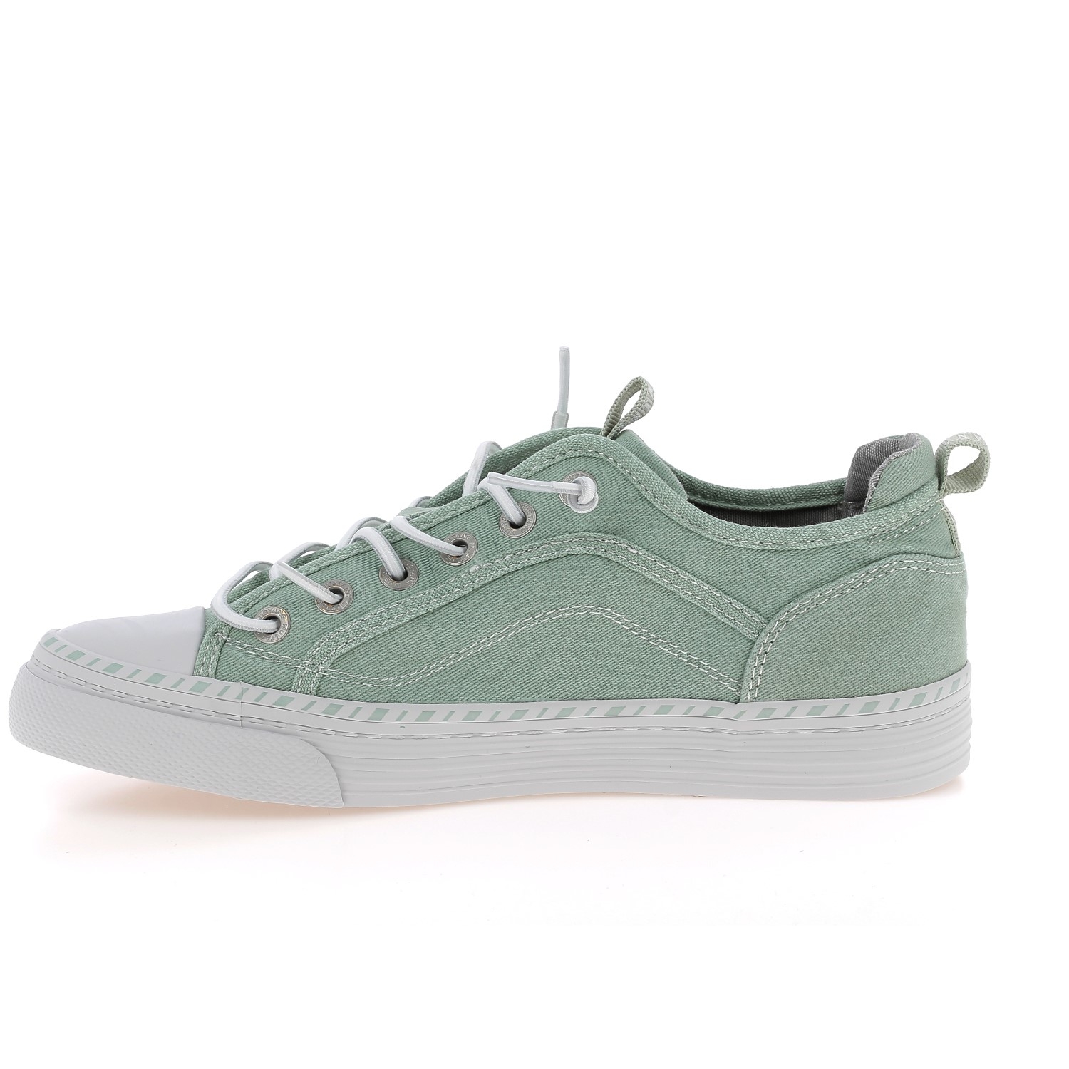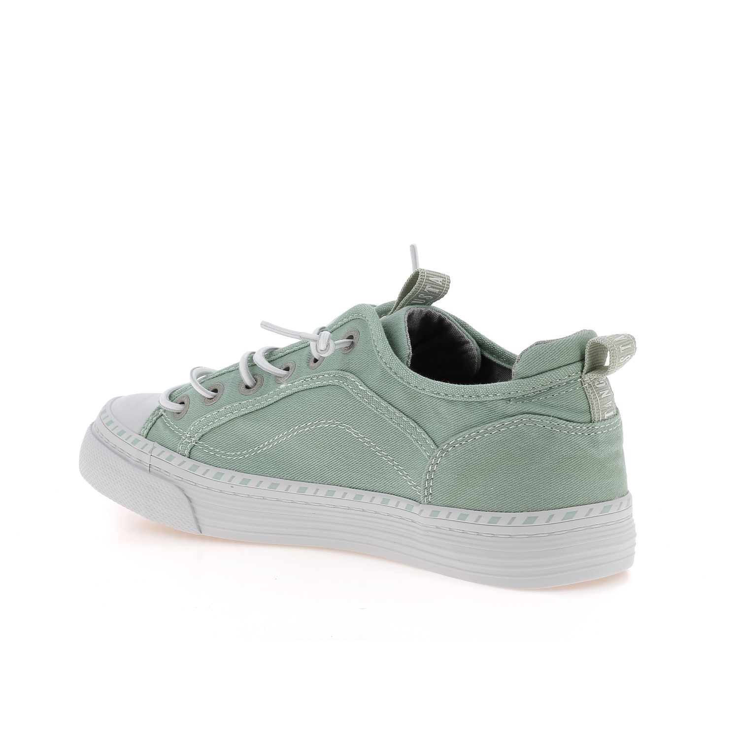 Baskets basses en toile pour femme de la marque Mustang. Chaussures basses vertes claires, légères parfaites pour le printemps et l'été.